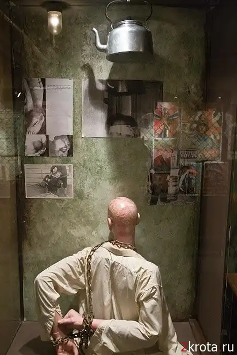 В соседнем помещении располагалась пыточная камера. Здесь воспроизведена реальная сцена пытки семейной пары подпольщиков, взятых гестаповцами в 1943 г. во время сеанса связи с разведцентром в Лондоне. Двое гестаповцев пытают жену на глазах мужа, прикованного цепью к стене. В углу, на железной балке, подвешен еще один участник провалившейся подпольной группы. Говорят, перед допросами гестаповцы накачивались спиртным и наркотиками.