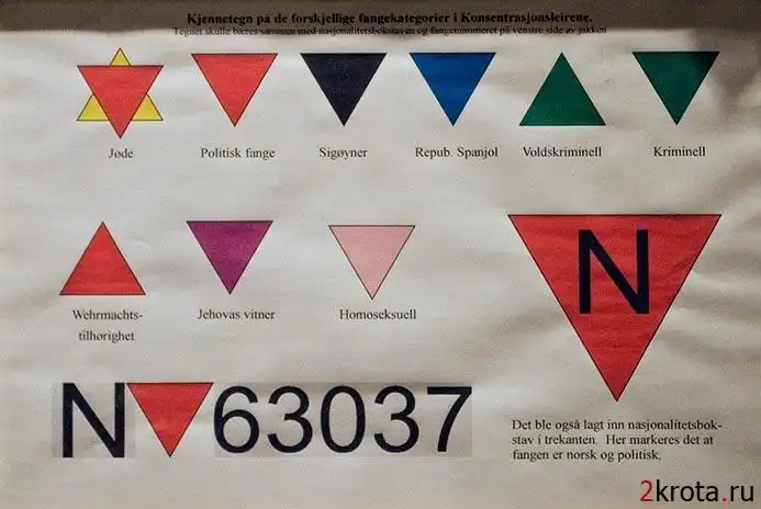 Система обозначения разных групп заключенных в концлагере Освенцим (Аушвиц-Биркенау). Еврей, политический, цыган, испанский республиканец, опасный уголовник, уголовник, военный преступник, свидетель Иеговы, гомосексуалист. На значке норвежского политического заключенного писали букву N.