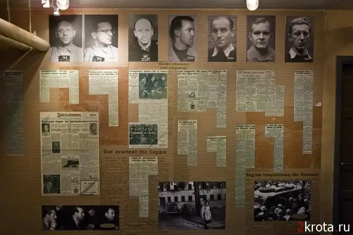 Две стены в мрачных коридорах музея отданы материалам уголовного дела, по которому судили семерых главных гестаповцев в Кристиансанде. В норвежской судебной практике таких дел еще никогда не было – норвежцы судили немцев, граждан другого государства, обвиненных в преступлениях на территории Норвегии. В процессе участвовали триста свидетелей, около десятка адвокатов, норвежская и зарубежная пресса. Гестаповцев судили за пытки и издевательства над арестованными, отдельно шел эпизод о казни без суда и следствия 30 русских и 1 польского военнопленного. 16 июня 1947 г. все были были приговорены к смертной казни, которая впервые и временно была включена в УК Норвегии сразу после окончания войны.