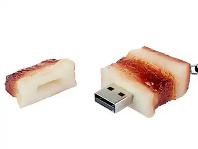 Надеюсь, Вы сначала посмотрели картинки, а только потом прочитали подводку. :) Отличная дизайнерская задумка - сделать скучную флешку в виде кусочка копчености. Очень себе такую бы хотелось. Даже на вид кажется, что от нее руки жирными станут. :)