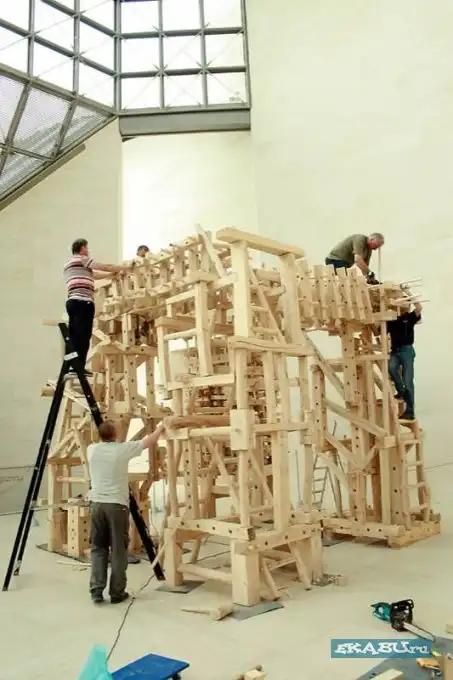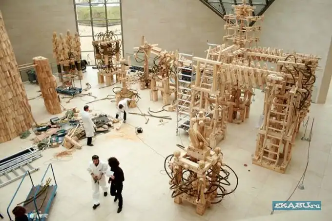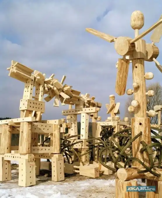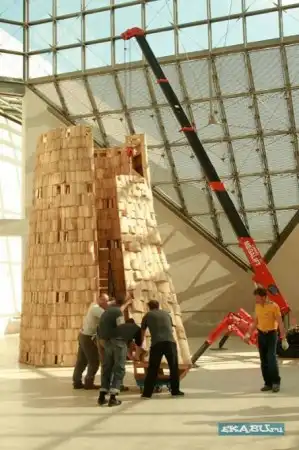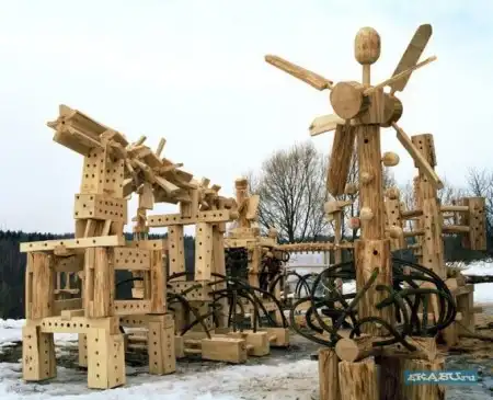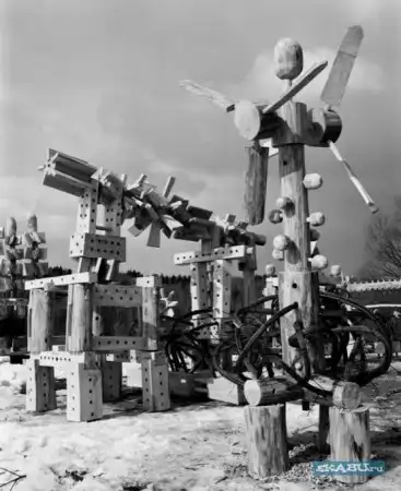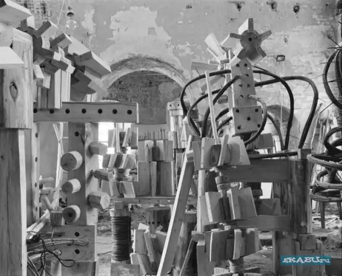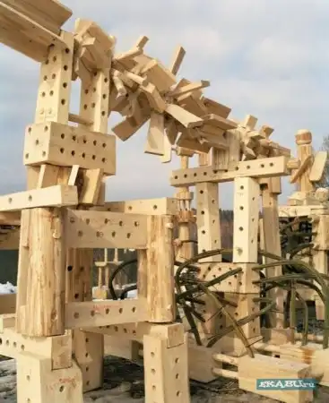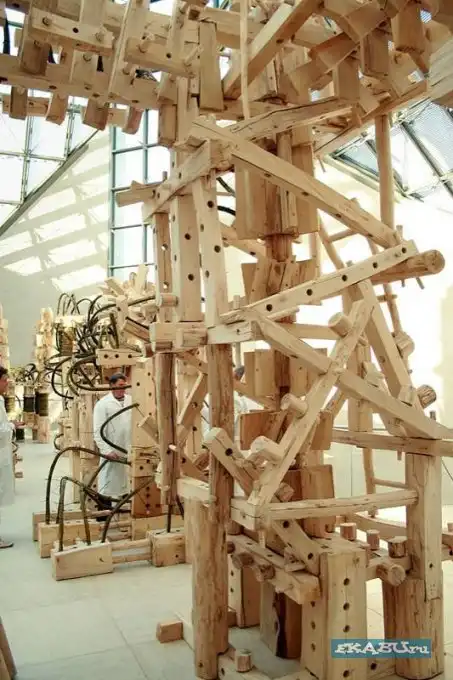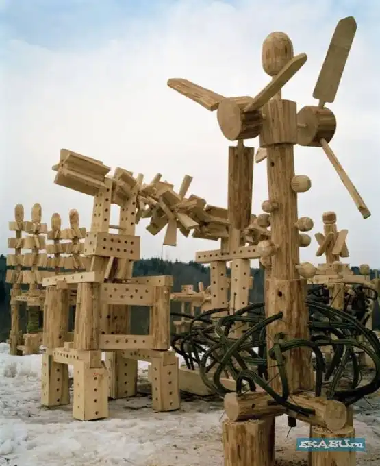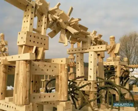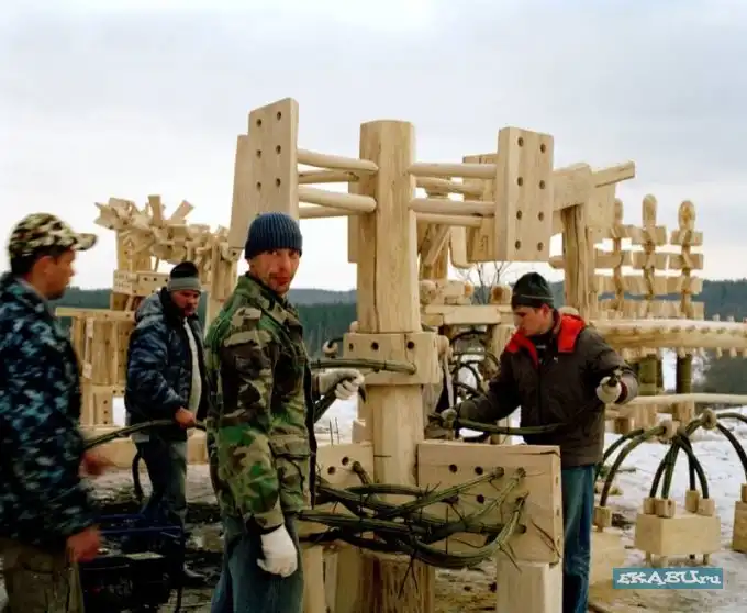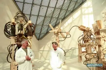 "Большой адронный коллайдер" Николая Полисского и его команды и вправду немаленький — это десяток сложносочиненных конструкций во главе с восьмиметровой башней, вздымающей к космосу "руки"-антенны. Башня снабжена колесом-штурвалом, каким обычно открывают тяжелые металлические двери, но в ней нет никакого металла. Все остальные агрегаты тоже сделаны исключительно из природных материалов — например, роль электрических проводов исполняет лоза, собранная в мощные пучки или свернутая в катушки. В целом деревянные "приборы" имеют совершенно фантастический вид, хотя в их хитросплетениях можно угадать узнаваемые детали — вентиляторы, антенны, трансформаторы и даже старорежимные компьютерные платы. Но основная масса деталей не поддается идентификации, что входит в замысел художника, ведь современная физика вещь труднопредставимая и практически неосязаемая.