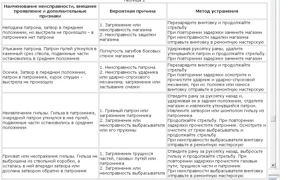 Возникшую при стрельбе задержку устраняйте перезаряжанием, для чего быстро отведите раму за рукоятку назад, отпустите ее и продолжайте стрельбу. Если задержка не устранена, то выясните причину ее возникновения и устраните задержку, как указано в таблице 2.