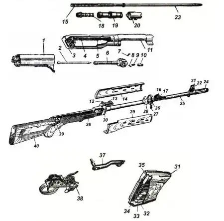 1- рама 6В1. 2-7; 2- ударник 6В1 2-5; 3- крышка 6В1. сб. 5; 4- стержень направляющий 6В1. 5-6; 5- втулка направляющая 6В1. 5-5; 6- затвор 6В1. 2-1; 7- ось выбрасывателя 6В1. 2-3; 8- штифт ударника 6В1. 2-6; 9- пружина выбрасывателя 6В1. 2-4; 10- выбрасыватель 6В1. 2-2; 11- пружина возвратная 6В1. 5-4; 12- хомутик планки прицельной 6В1. 48; 13- планка прицельная 6В1. 1-21; 14- накладка левая в сборе 6В1. сб. 1-3; 15- пружина толкателя 6В1. 1-24; 16- защелка газовой трубки 6В1. 1-38; 17- камера газовая 6В1. 1-15; 18- поршень газовый 6В1. 1-22; 19- трубка газовая 6В1. 1-25; 20- регулятор газовый 6В1. 1-53; 21- корпус мушки 6В1. 1-20; 22- мушка 6В1. 1-17; 23- толкатель 6В1. 1-23; 24- основание мушки 6В1. 1-16; 25- ствол 6В1. 1-1; 26- кольцо верхнее в сборе 6В1. сб. 1-1; 27- чека кольца 6Bl. сб. 1-7; 28- сальник в сборе 6В1. сб. 1-8; 29- накладка правая в сборе 6В1. сб. 1-4; 30- кольцо нижнее с пружиной 6В1. сб. 1-5; 31- корпус магазина 6В1. сб. 6-1; 32- пружина магазина 6В1. 6-12; 33- крышка магазина 6В1. 6-11; 34- планка в сборе 6В1. сб. 6-3; 35- подаватель 6В1. сб. 6-2; 36- коробка 6В1. 1-2; 37- щиток в сборе 6В1. сб. 3; 38- механизм ударно-спусковой 6В1. сб. 4; 39- чека крышки 6В1. сб. 1-2; 40- приклад 6В1. сб. 7