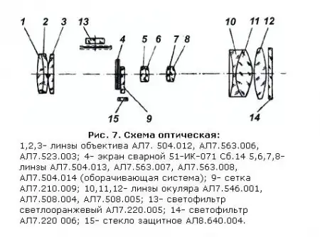 Оптическая система (рис. 7) состоит из линз объектива, сетки, оборачивающей системы, линз окуляра, экрана, светофильтра, светофильтра светло-оранжевого и защитного стекла.