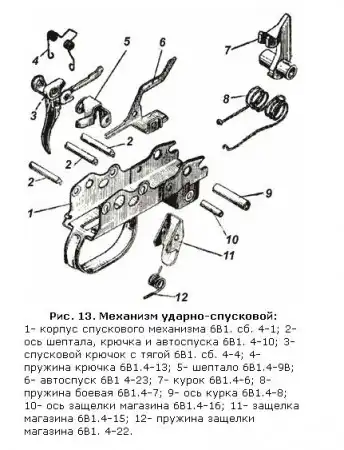 д) разберите ударно-спусковой механизм (рис. 13). Нажмите на рычаг автоспуска и разъедините шептало автоспуска с курком, придерживая курок, нажмите на спусковой крючок и плавно спустите курок с боевого взвода; выведите концы пружины спускового крючка из-под загибов корпуса ударно-спускового механизма; при помощи отвертки совместите выступы осей спускового крючка, шептала и автоспуска с вырезами для них на правой стенке корпуса ударно-спускового механизма: вытолкнув оси спускового крючка, шептала и автоспуска, отделите эти детали; вытолкнув ось курка, отделите курок с боевой пружиной, а затем снимите боевую пружину;
