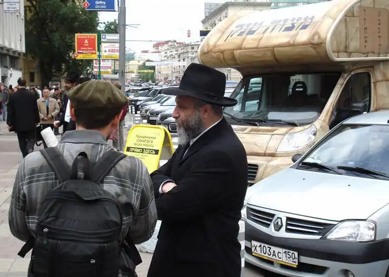 Прогуляйтесь по центру Москвы - и вы обязательно встретите этот "Мицва мобиль" с двумя раввинами на борту. Раввины расспрашивают прохожих на предмет их веры и, если они являются иудеями, то приглашают их в машину помолиться и просто побеседовать.