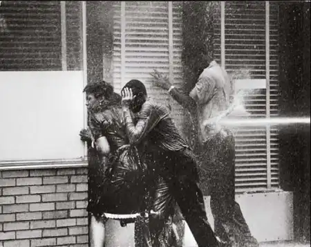 Город Бирмингхем, штат Аляска, долгое время был известен, как очаг конфликтов между довольно многочисленным афроамериканским населением и белым большинством. На фотографии один из эпизодов подавления мирной демонстрации за права негров, которые организовывал Мартин Лютер Кинг. Полиция применяет аресты, конные части и стрельбу из брансбойтов, травит людей собаками.