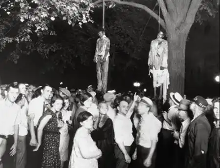 Линчевание молодых негров. Эта знаменитая фотография сделана в 1930 г. Чернокожие мужчины, над которыми было совершено линчевание, обвинялись в изнасиловании белой женщины и убийстве ее жениха. На казнь собралась толпа зевак порядка 10000 человек.