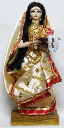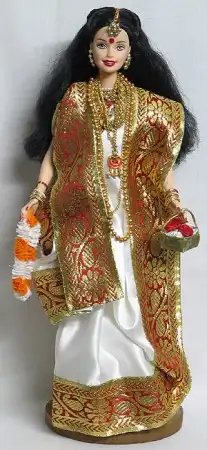 Портной увидел прекрасную деревянную куклу. Он взял разноцветные ткани, снял с куклы мерку и принялся шить. Он сшил кукле нарядную кофточку и широкую юбку, а из красной цветистой материи сделал ей сари. Одел портной куклу, как девушку, и поставил рядом с собой.