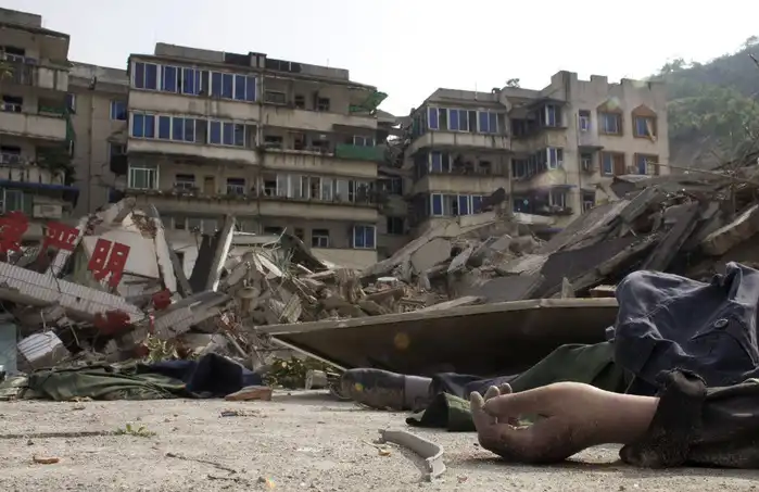 The hand of a dead body lies on the ground amongst the rubble of the earthquake ravaged town May 15, 2008 in Beichuan, Sichuan province, China. (Paula Bronstein/Getty Images)