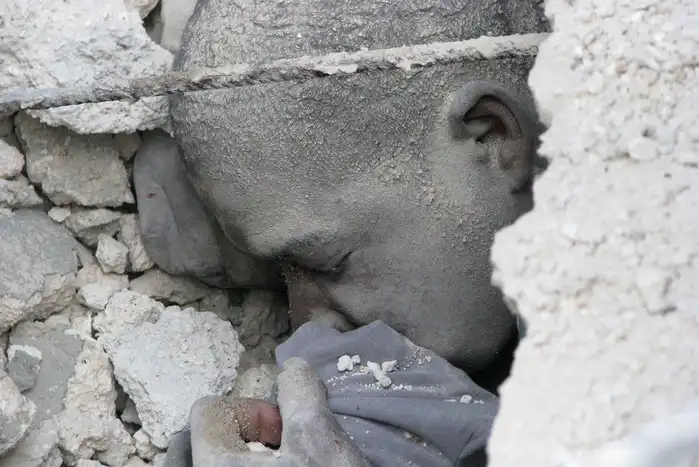 The head of a male student, still alive, trapped under the debris is pictured at the scene of the church school that collapsed on the outskirts of Haiti's capital Port-au-Prince, November 7, 2008. At least 30 people were killed when the three-story La Promesse school building collapsed while class was in session and some of the walls and debris crushed neighboring homes in the Nerettes community near Port-au-Prince. (REUTERS/Joseph Guyler Delva)