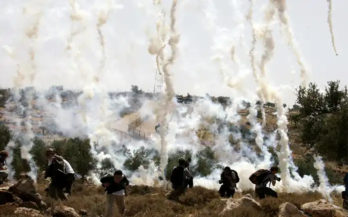Tear gas cannisters fired by Israeli soldiers fall from the sky on Palestinian and Israeli peace activists during a protest agaisnt the construction of Israel's controversial security barrier in the West Bank village of Bilin, near Ramallah, on June 6, 2008. (Abbas Momani/AFP/Getty Images)