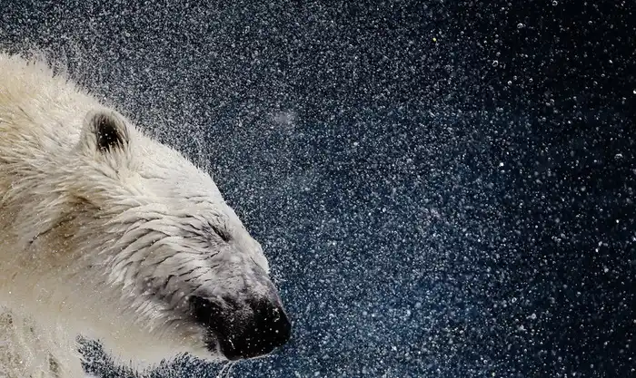 A polar bear shakes his body to remove water at the St-Felicien Wildlife Zoo in St-Felicien, Quebec on March 6, 2008. (REUTERS/Mathieu Belanger)