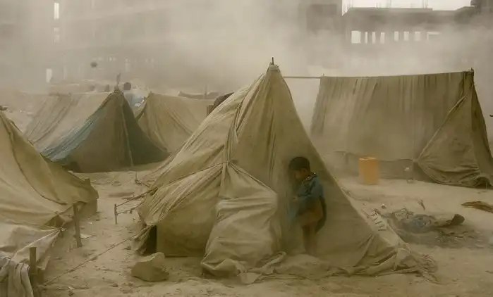 An Afghan refugee child hides from a dust storm behind a tent at a refugee camp in Kabul, Afghanistan on October 7, 2008. Over a quarter million Afghans have returned home this year from Pakistan and Iran, many of them reportedly due to economic and security uncertainties faced in exile, the United Nations said. (MANPREET ROMANA/AFP/Getty Images)