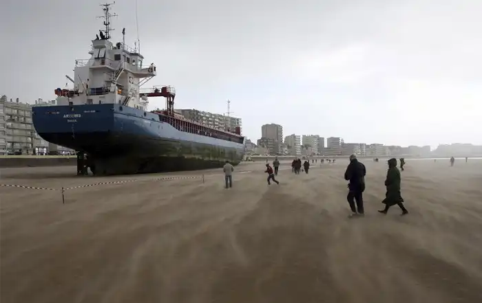Locals and tourists walk around the Dutch ship Artemis which ran aground on the beach of les Sables d'Olonne, southern French Britanny, western France, March 10, 2008. The boat had been driven onto the coast by the wind blowing more than 130 km per hour. (REUTERS/Stephane Mahe)