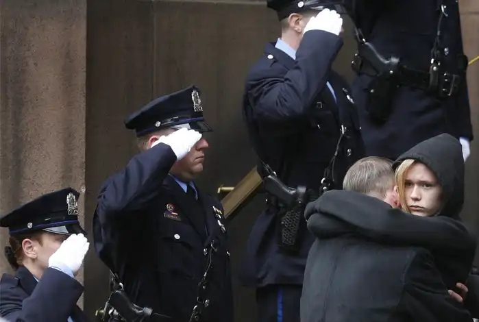 Children of slain Philadelphia police sergeant Stephen Liczbinski, Amber and Steve embrace after their father's funeral mass on the steps of the Cathedral Basilica of Saints Peter and Paul in Philadelphia, Pennsylvania May 9, 2008 Sergeant Liczbinski was gunned down as he investigated a bank robbery on May 3. (REUTERS/Tim Shaffer)