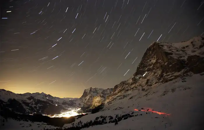 Time exposure of the Swiss mountain resort of Grindelwald next to the north face of the Eiger mountain, seen on January 10, 2008. (REUTERS/Stefan Wermuth)