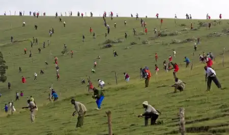 Maasai warriors cover a battle field as they clash with bows and arrows with members of the Kalenjin tribe in the Kapune hill overlooking the Olmelil valley located in the Transmara District in Western Kenya on March 01, 2008. The Massai, the Kalenjin and the Kisii tribes have recently clashed over ongoing land disputes that erupted after botched local elections during the general elections held in Kenya in December of 2007. Over twenty warriors from the tribes have been killed in bow and arrow battles near the borders of these tribes in the last couple of months. (Yasuyoshi Chiba/AFP/Getty Images)