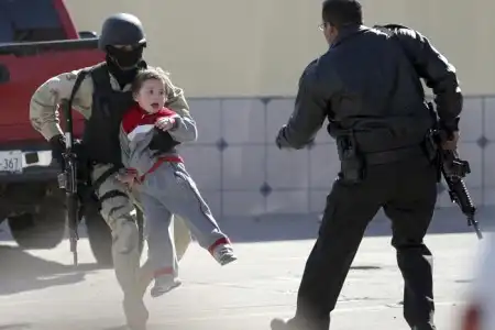 A policeman carries a child away during a gun battle in Tijuana, in Mexico's state of Baja California, January 17, 2008. A shootout on Thursday, after police agents moved in on a drug cartel group, left four people injured and forced the emergency evacuation of a school in Tijuana, according to the local media. (REUTERS/Jorge Duenes)