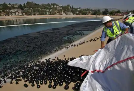 Department of Water and Power workers are emptying out bales of plastic balls in the Ivanhoe reservoir in Los Angeles on Monday, June 9, 2008. Department of Water and Power released about 400,000 black plastic 4-inch balls as the first installment of approximately 3 million to form a floating cover over 7 acres of the reservoir to protect the water from sunlight. When sunlight mixes with the bromide and chlorine in Ivanhoe's water, the carcinogen bromate can form. (Irfan Khan/AP)