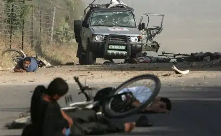 Wounded Palestinians lay near Reuters news agency reporter Fadel Shaana's car after it was hit by an Israeli missile on April 16, 2008 in the central Gaza Strip. The Israeli air strike killed a Palestinian cameraman working for the Reuters news service and two other civilians, Palestinian medics and witnesses said. (MOHAMMED ABED/AFP/Getty Images)