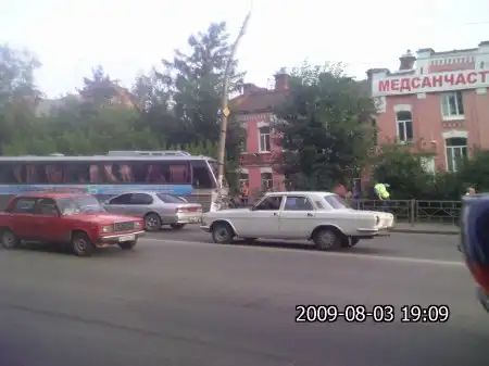 Но это еще цветочки... После аварии у автобуса заклинило рулевое управление, он простоял сутки возле магазина (его немного оттащили). Когда его забирали это была вообще жесть дергали этот автобус минут 15 практически на одном месте, потом прицепили жесткой сцепкой к большой машине (непомню как она называется), приловчились и поехали!
