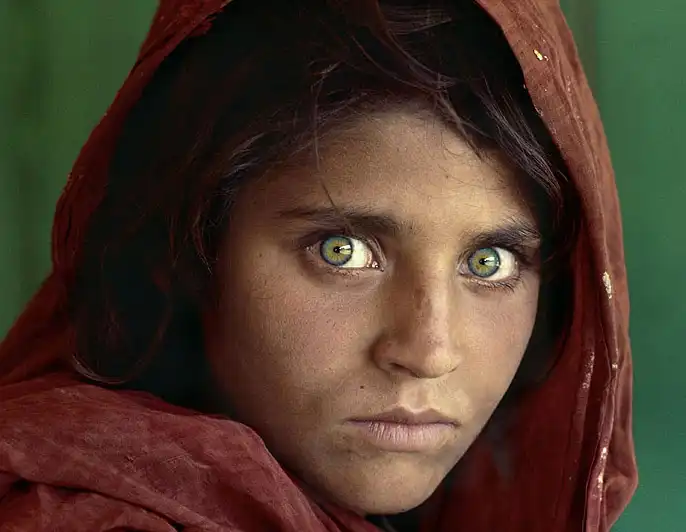 Фотограф Стив Маккари заметил 13-летнюю Шарбат в лагере беженцев в Насир Баге, в Пакистане. Туда она попала вместе с родственниками после того, как ее отец и мать погибли во время вторжения советских войск. "Этот портрет для меня суммировал ее душевные раны, ее судьбу, вообще всю ситуацию при которой человек вынужден сняться с места и жить в лагере беженцев за сотни миль от своего дома", - рассказывает Маккари.
