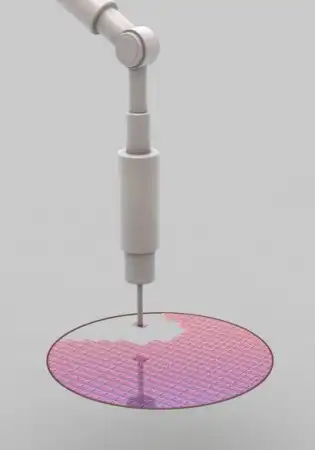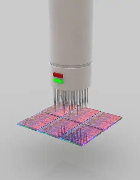 На иллюстрации участок готовой подложки проходит первый тест функциональности. На данном этапе тестовые пробы подводятся к каждому чипу, после чего оцениваются ответные сигналы чипа и сравниваются с правильными.