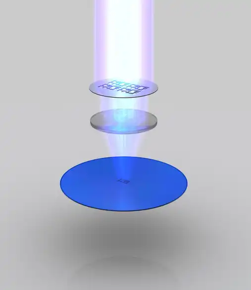 Линза (в середине) уменьшает маску до небольшой фокусной области. В итоге "отпечаток" на подложке обычно в четыре раза меньше (линейно), чем трафарет маски.