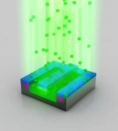 После внедрения ионов фоторезистивный слой удаляется, а материал, подвергшийся легированию (зелёный) теперь насыщен чужеродными атомами.