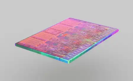 На иллюстрации приведен отдельный кристалл, который был вырезан с подложки. Если быть более конкретным, то перед нами кристалл Core i7.