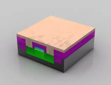 Транзистор всё ближе к своему завершению. На изолирующем слое над транзистором (фиолетовый) вытравливаются три области. Три этих отверстия будут заполнены медью, которая позволит проводить электрические соединения с другими транзисторами.