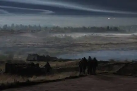 Осветительные снаряды превращают поле боя в нереально красивую картину - восхитительную и жуткую одновременно. Свет играет на высотах местности, сюрреалистично подсвечивая стелящийся по низинам дым и туман: