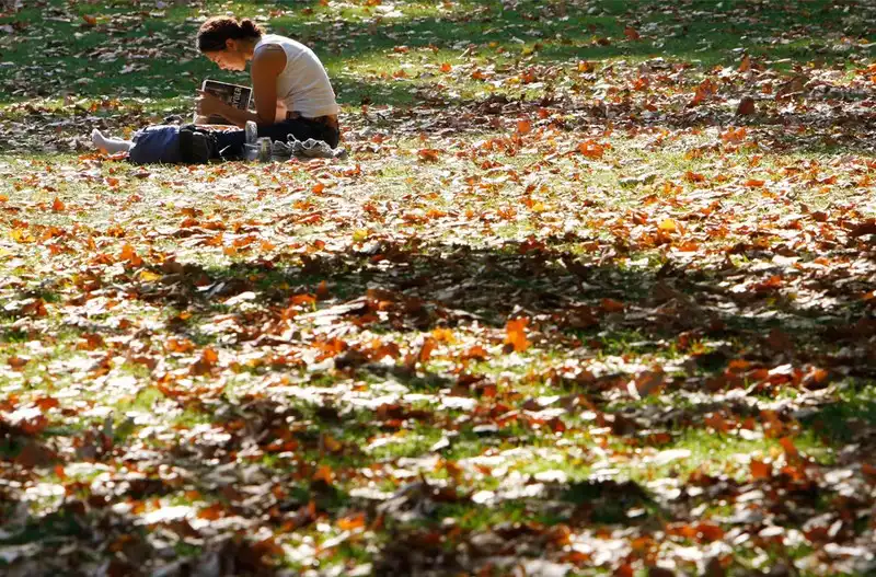 16. Девушка читает на опавшей листве теплым осенним деньком в парке святого Джеймса в Лондоне 26 сентября 2009 года. (REUTERS/Luke MacGregor)