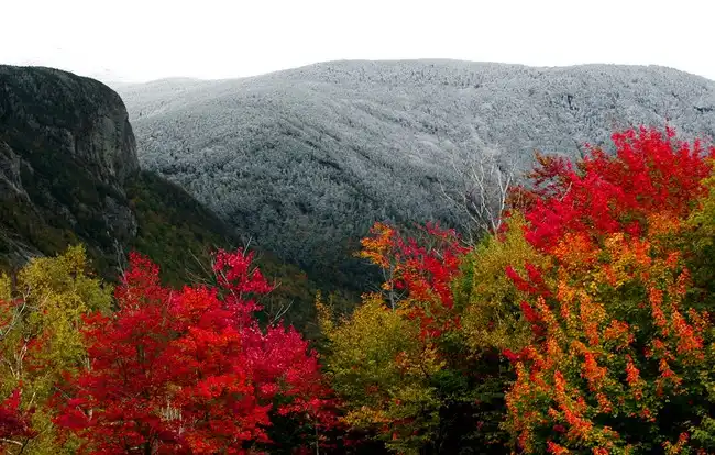 9. Осенняя листва встречает ранний снег в Франконии, Нью-Хэмпшир, в четверг 1 октября 2009 года. (AP Photo/Jim Cole)