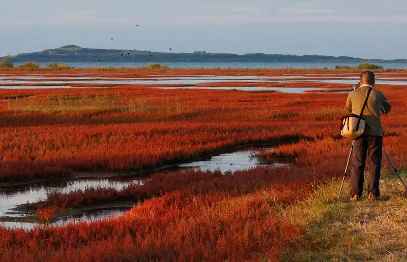 24. Мужчина фотографирует солянку на озере Ноторо в Абашири на Японском северном острове Хоккайдо 22 сентября 2009 года. Многие люди приходят на озеро, чтобы насладиться пейзажем растений в соляных болотах, которые становятся ярко-красными в период между концом сентября и октябрем. (REUTERS/Yuriko Nakao)