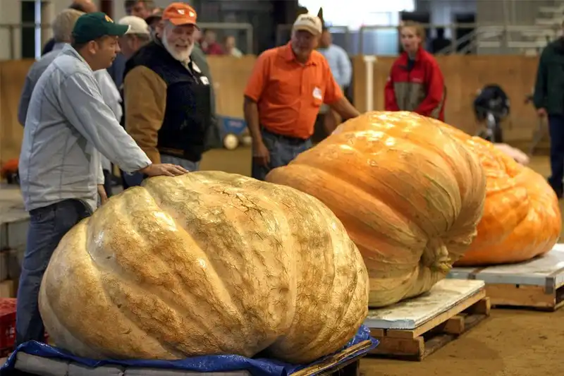 28. Фермеры стоят у своих гигантских тыкв во время ежегодного конкурса самой большой тыквы на ярмарке в Топсфилде, штат Массачусетс, 3 октября 2009 года. Конкурс выиграл Билл Родонис (в центре) из Личфилда, Нью-Хэмпшир, - его тыква весила 667,51 кг. (John Tlumacki/Globe Staff)