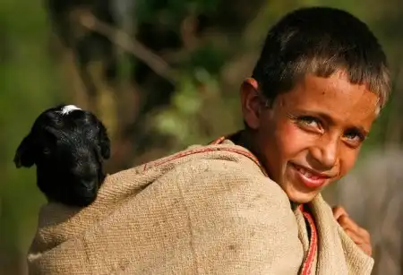 13. 10-летний Бин Амин – кашмирский кочевник – несет на плечах ягненка, идя за своим стадом козлов и овец в Шринагаре 5 октября 2009 года. Летом кочевники проходят несколько километров через горы в поисках пахотных пастбищ для своего домашнего скота, а зимой возвращаются обратно на равнины. (REUTERS/Fayaz Kabli)