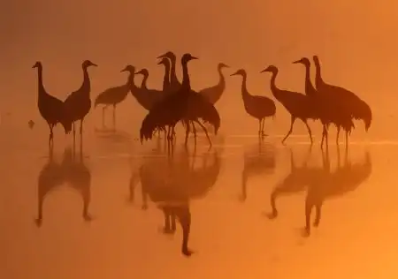 1. Стая журавлей собралась на закате на озере в Бранденбурге, Германия, недалеко от Берлина 26 сентября 2009 года. С сентября по ноябрь десятки тысяч журавлей делают в деревнях Германии привал во время миграции из Скандинавии и Восточной Европы в Испанию. Сельскохозяйственные поля вокруг Берлина – одно из крупнейших мест обитания нескольких тысяч птиц, собирающихся здесь во время перелетов. (REUTERS/Thomas Krumenacker)