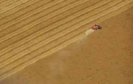 7. Комбайн собирает пшеницу в поле к югу от Чэпмэна, штат Канзас, во время сбора урожая при подготовке к зиме. Элеваторы на Великих Равнинах остаются до краев заполненными нераспроданной пшеницей, так как власти готовятся к ожидаемому упадку урожая кукурузы, сорго и соевых бобов. (AP Photo/Charlie Riedel)