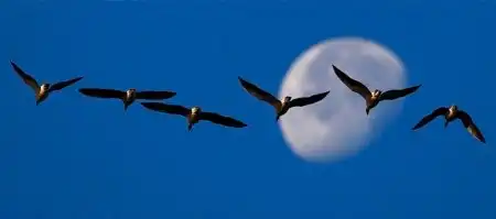 17. Стая диких гусей пролетает на фоне луны, готовясь приземлиться в заповеднике Вэйн Фарм недалеко от Файфа, Шотландия, 8 октября 2009 года. Около 20 000 диких гусей останавливаются в заповеднике каждый год во время своей миграции на юг из Исландии. Некоторые отдыхают и летят дальше, некоторые остаются здесь. (REUTERS/David Moir)