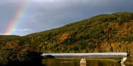 27. Радуга над крытым мостом, соединяющим Уиндсор, штат Вермонт (слева), и Корниш, штат Нью-Хэмпшир (справа) в понедельник 5 октября 2009 года. (AP Photo/Jim Cole)