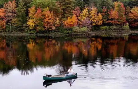 30. Питер Стерретт из Тивертона, Род-Айленд, плывет на лодке со своим псом Коди на пруду в Дерри, Нью-Хэмпшир, в воскресенье утром 4 октября 2009 года. (AP Photo/Charles Krupa)