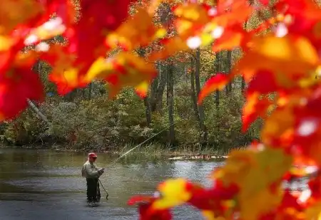 22. 71-летний Лин Уолтерс рыбачит в реке Мэрритайм в Альтоне, Нью-Хэмпшир, на фоне уже поменявших цвет листьев в четверг 8 октября 2009 года. (AP Photo/Jim Cole)