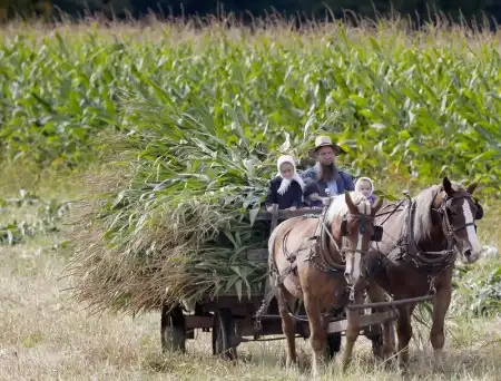 21. Амишский фермер и трое его детей едут в полной кукурузы телеге на ферме в Миддлфилде, штат Огайо, в четверг 8 октября 2009 года. (AP Photo/Amy Sancetta)