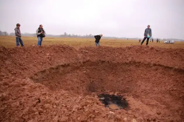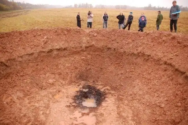 Вечером в воскресенье, 25 октября, латвийские СМИ сообщили о падении метеорита в 18.30 неподалеку от города Мазсалаце Валмиерского района республики. В районе падения "метеорита" образовался кратер шириной 20 и глубиной 10 метров. Сообщалось, что небесное тело якобы рухнуло на землю рядом с жилым домом, однако, пострадавших не было. Однако в воронке была найдена перегоревшая селитра и сера, а осколков метеорита, которые должны были остаться после удара небесного тела о землю, обнаружить не удалось. Как заявил геолог Северо-Видземского биосферного заповедника республики Дайнис Озолс, воронка была вырыта людьми, а возгорание искусственно вызвано смесью селитры с серой. "Латвия стала интересна, и не тем, что у нас кризис, нам тяжело и трудно, а тем, что здесь произошло что-то интересное и креативное", - заявил Янис Спрогис.