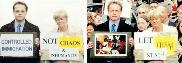 Апрель, 2005: Два английских политика-консерватора держат плакат "Контроллируемая Иммиграция. Нет хаосу и бесчеловечности" Реально же на плакатах было написано "Пусть остаются" и фотография была сделана во время протеста против депортации семьи-иммигрантов.