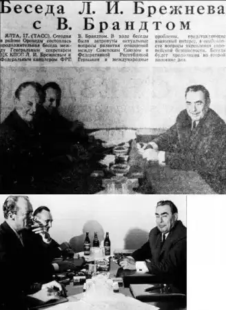Сентябрь, 1971: Канцлер ФРГ Вилли Брандт на встрече с Леонидом Брежневом. Ходили слухи, что оба были изрядно пьяные во время переговоров. Правда или нет - уже не узнать. Но вот в немецкой прессе была фотография, на которой на заднем плане видны бутылки вина, в советской же прессе бутылки закрасили.