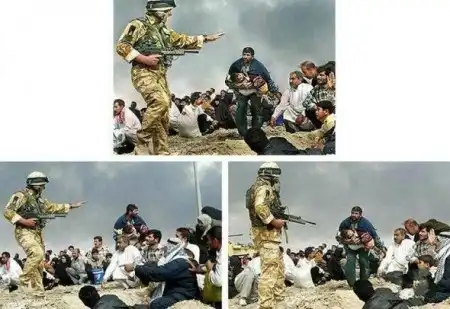 Апрель, 2003: Эта фотография была создана из двух фотографий, которые вы видите под ней. За подделку фотографии английского солдата в Басре фотограф с 30-летним стажем был уволен из Los Angeles Times.