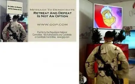 Декабрь, 2005: Снова политическая реклама. В конце ролика фотография. Солдат перед экраном, на котором написано "Наши солдаты смотрят, но и враги тоже". На оригинальной фотографии видно, что солдат смотрит фильм "Гринч - похититель Рождества".